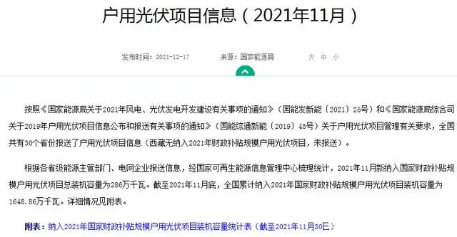 根據(jù)國家能源局統(tǒng)計數(shù)據(jù),截止到2021年11月30日,全國僅2021年納入國家財政補(bǔ)貼的戶用光伏就已經(jīng)達(dá)到了1648萬千瓦,遠(yuǎn)遠(yuǎn)超出今年的戶用光伏補(bǔ)貼指標(biāo)。如果算上最后一個月份的話,最少也在1800萬千瓦以上。今年一年的全國的安裝戶數(shù),預(yù)計在100萬戶以上。
